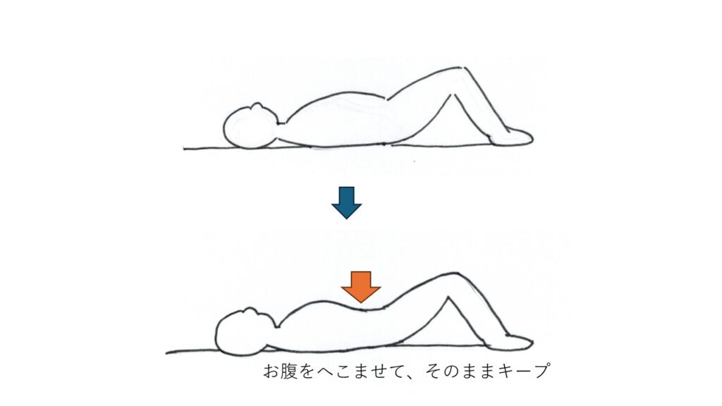2. 息を吐きながら、骨盤を後ろに傾けて背中を少し丸める